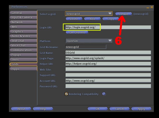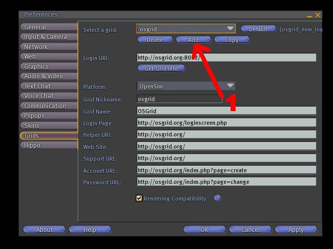 As of October 19, 2010 the basic OSgrid login address that comes with the Hippo viewer is not correct anymore. If your viewer shows the old login URI of OSgrid: then you have to change it. The correct Login URI as of October 19, 2010 is: http://login.osgrid.org/ On the Hippo viewer you cannot change the existing OSgrid URI. However you can add a new grid login. How to add a new Grid Login is described here on this page in 6 steps |